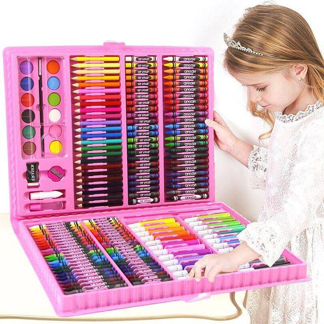 В нашем наборе есть все необходимое для занятие любимым дело, а именно 150 предметов : цветные карандани, акварельные краски, восковые мелки, маркеры, канцелярские принадлежности и много другое.