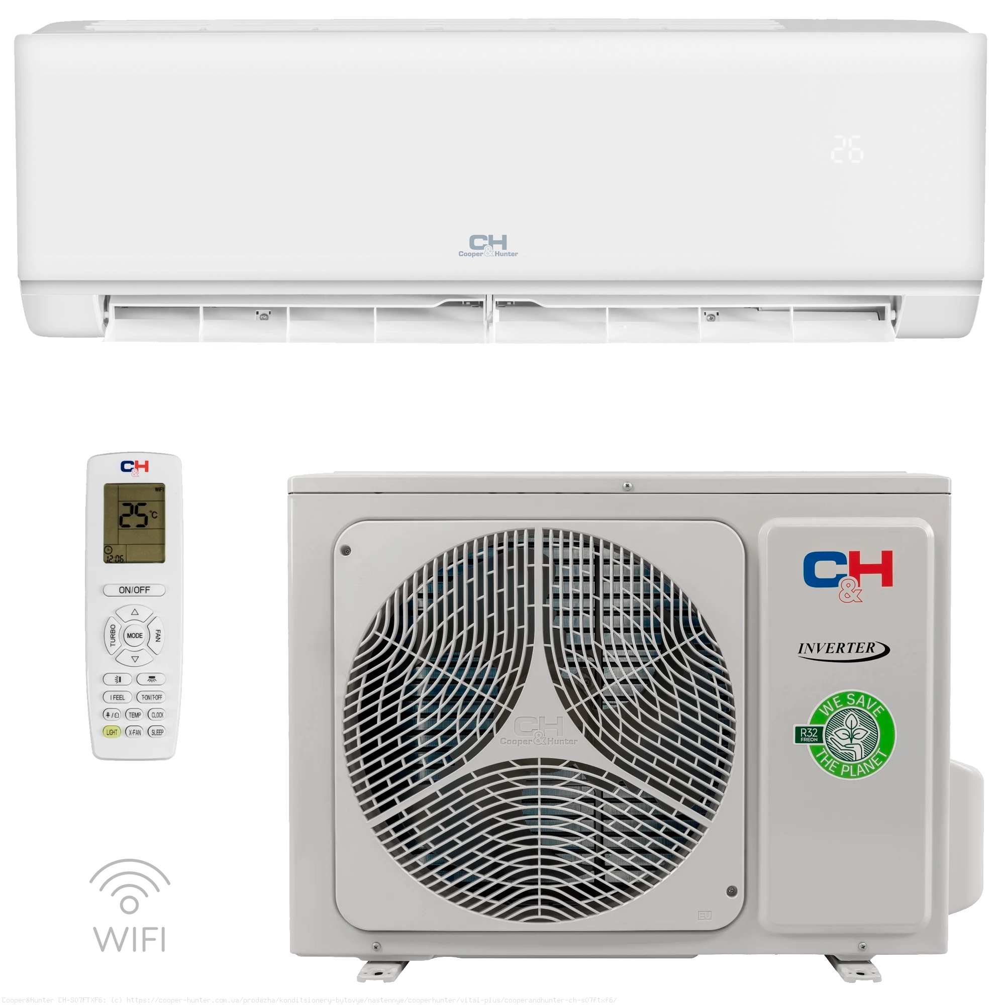 Cooper&Hunter VITAL Plus CH-S12FTXF6 — инверторная настенная сплит-система для помещений до 35 м² рассчитанная на поддержание стабильной производительности в широком диапазоне нагрузки с поддержкой режимов охлаждения, обогрева, осушения, очистки и вентиляции. Мощность в режиме охлаждения составляет 3,20 кВт с диапазоном регулирования 0,90–3,60 кВт. В режиме обогрева Cooper&Hunter VITAL Plus CH-S12FTXF6 мощность составляет 3,40 кВт и регулируется в пределах 0,90–4,00 кВт, когда требуется плавная подстройка мощности без частых остановок компрессора, что важно при ежедневной работе в межсезонье. Диапазоны наружных температур: на охлаждение от −15 °C до +43 °C, на обогрев от −15 °C до +24 °C. Внутренний блок поддерживает несколько ступеней скорости с воздушной производительностью до 590 м³/ч, а также управление горизонтальными жалюзи «право-лево» с пульта, чтобы точнее направлять поток по комнате. Для обслуживания теплообменника предусмотрена функция Double self-clean: блок выполняет цикл самоочистки с последовательным замораживанием и нагревом, снижая накопление загрязнений на ребрах. В системе очистки воздуха используется Plasma ion (CH-Ion filter) с ионизацией, а также набор дополнительных фильтров 7-sky для многоступенчатой фильтрации. В комплекте есть пульт ДУ, доступен 24-часовой таймер, авторестарт, самодиагностика и авторозмораживание. Cooper&Hunter VITAL Plus CH-S12FTXF6 поддерживает Wi-Fi-управление, поэтому режимы и параметры можно менять со смартфона, не находясь рядом с пультом.