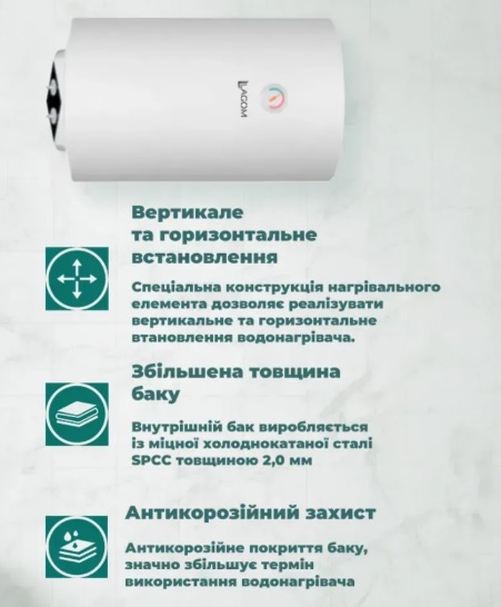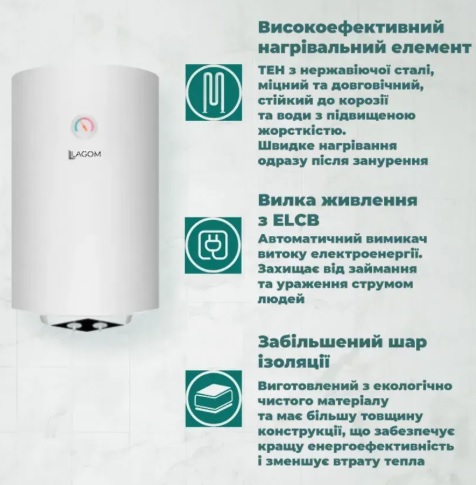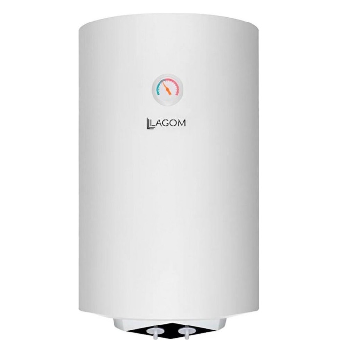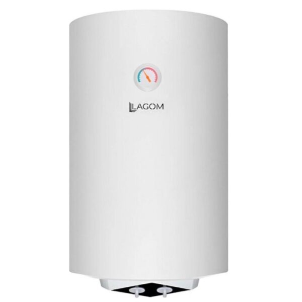 - Оптимизированная конструкция бойлера Lagom W5-50 (мокрый тэн). Модель выполнена в классическом белом цвете, в форме цилиндра, прекрасно интегрируется в пространство кухни, ванной комнаты или санузла. Lagom W5-50 (мокрый тэн) включает производство корпуса из качественного и прочного металла. Для внутреннего бака применяется холоднокатаная сталь (толщина 2 мм, марка SPSS). Обработка антикоррозийной эмалью продлевает эксплуатационній период. На фото видно, что в верхней части находится индикатор, показывающий степень нагрева воды.