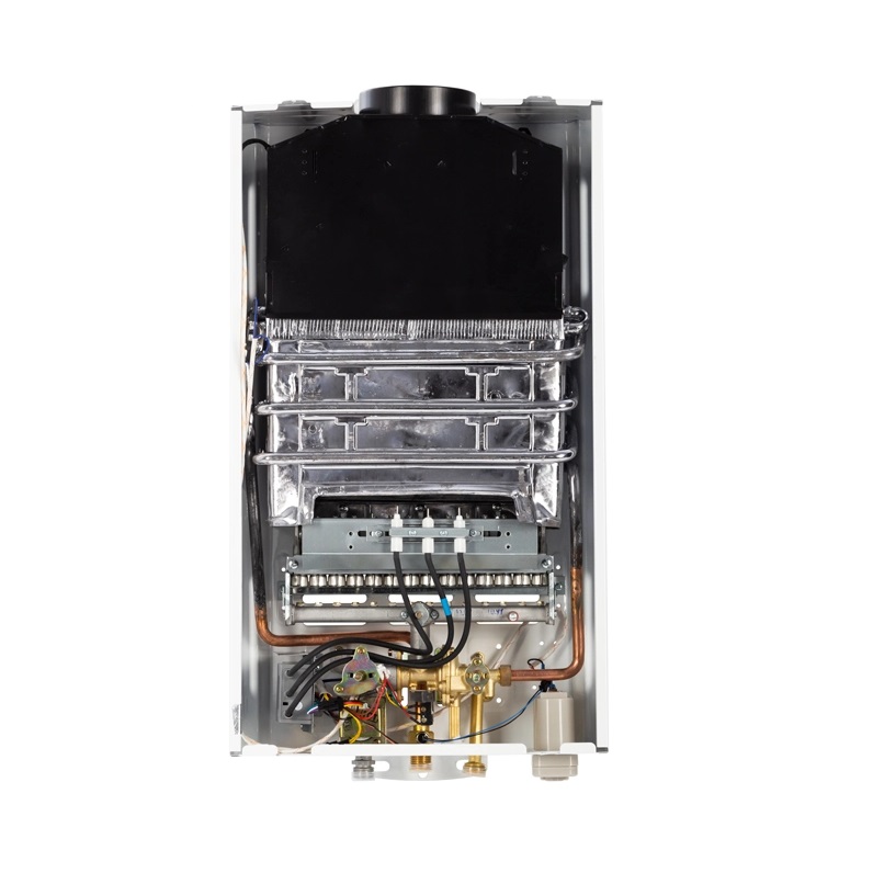 - Медный теплообменник, в котором не содержится примесей тяжелых металлов. Он быстро нагревает воду и экономит газ.